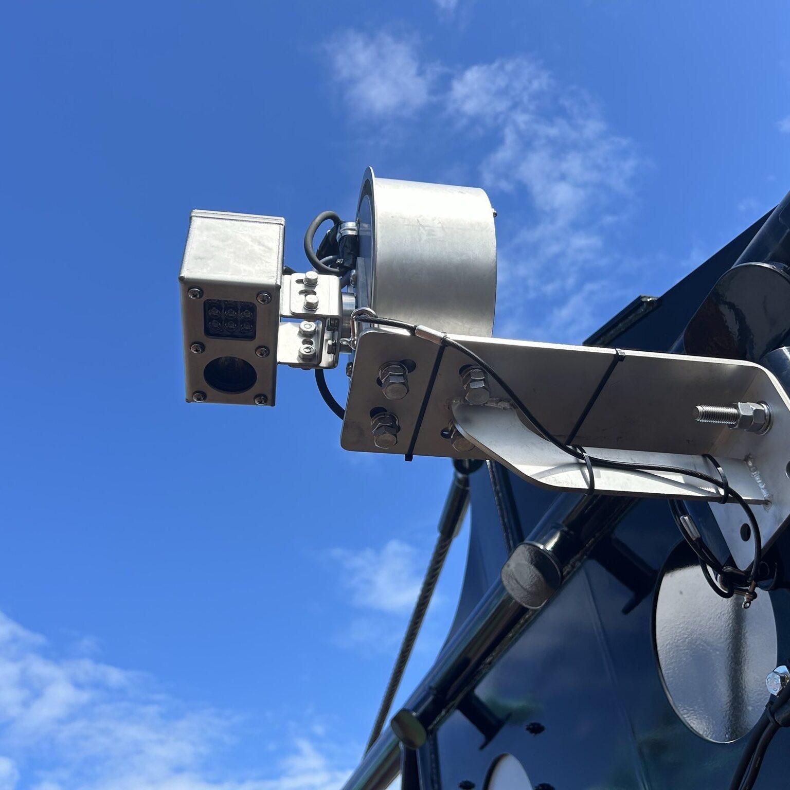 従来のカメラは自重でぶら下がっているため、真下以外の方向を大きくズラして見ることはできません。本カメラは上下最大180度の範囲で動作しますので海側の船内なども見ることができます。