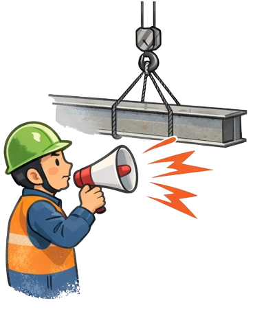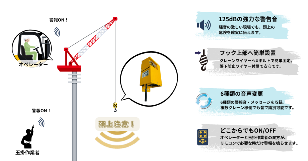 吊荷通過警報装置「ハイガード」は、クレーンワイヤー部分にUボルトで確実に固定する音声警報システムです。携帯式リモコンからワンタッチでON/OFFを操作でき、クレーンオペレーター・玉掛者・誘導員など複数の担当者がそれぞれのリモコンから操作可能。6種類の音声メッセージ・メロディで警報を発し、複数台のクレーンが混在する現場でも”どのクレーンの警報か”を作業員が音で識別できます。