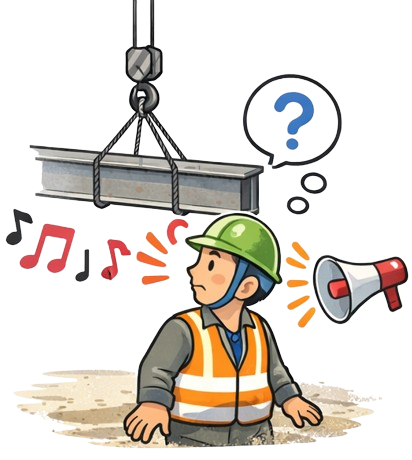 音声メッセージ・メロディは6種類から自由に設定できます。「頭上注意」など状況を言葉で伝えられるため、作業員への危険な伝達力が大幅に向上します。同一現場に複数のクレーンが稼働していても、作業員がどのクレーンの警報化を瞬時に聞き分けられます。