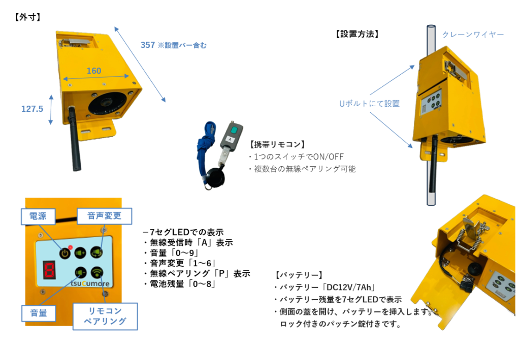 | メッセージ | ① ♪頭上、クレーンが通過します、ご注意ください(女性B) ② ♬頭上、クレーンが通過します、ご注意ください(女性A) ③ 警報音A ④ 警報音B ⑤ メロディA ⑥ メロディB ※ バッテリー消耗時:🎵バッテリーを充電してください | |
